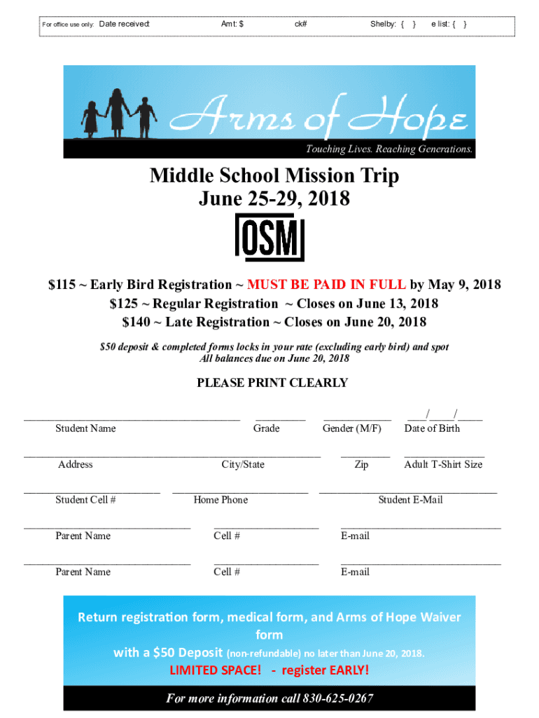 For office use only:Date received:Amt: ACK#Shelby: e list: Touching Lives. Reaching Generations. Middle School Mission Trip June 2529, $2018115 Early Bird Registration MUST BE PAID IN FULL by May