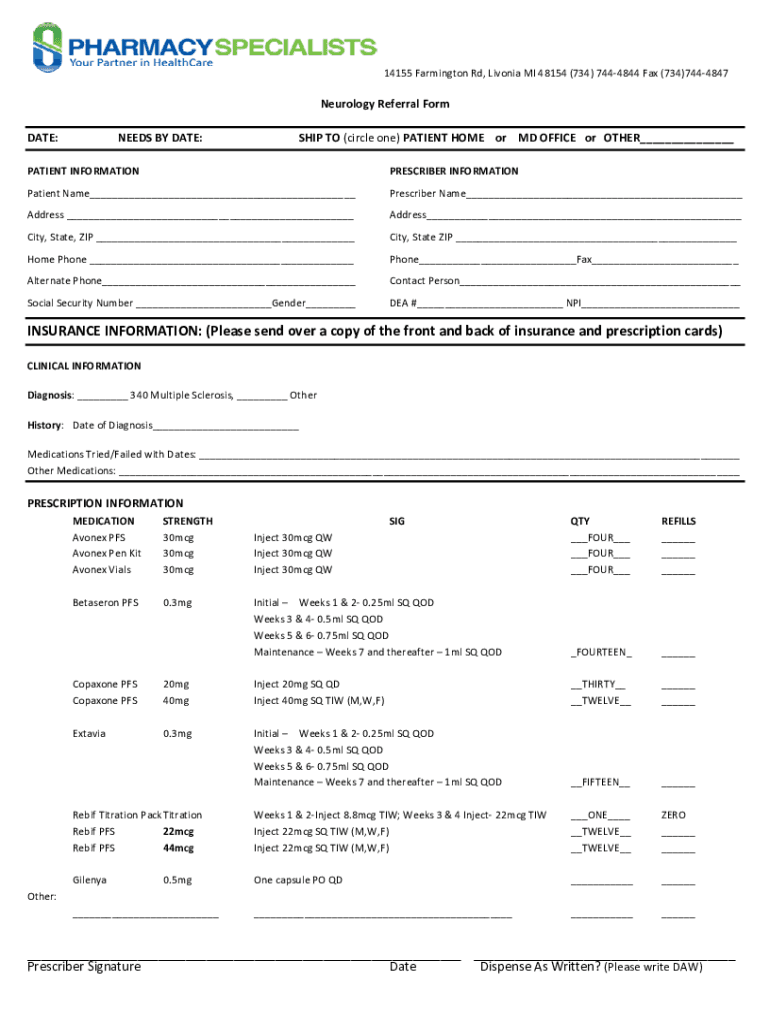 14155 Farmington Rd, Livonia MI 48154 (734) 7444844 Fax (734)7444847Neurology Referral Form DATE:NEEDS BY DATE:SHIP TO (circle one) PATIENT HOME or MD OFFICE or OTHER PATIENT INFORMATIONPRESCRIBER