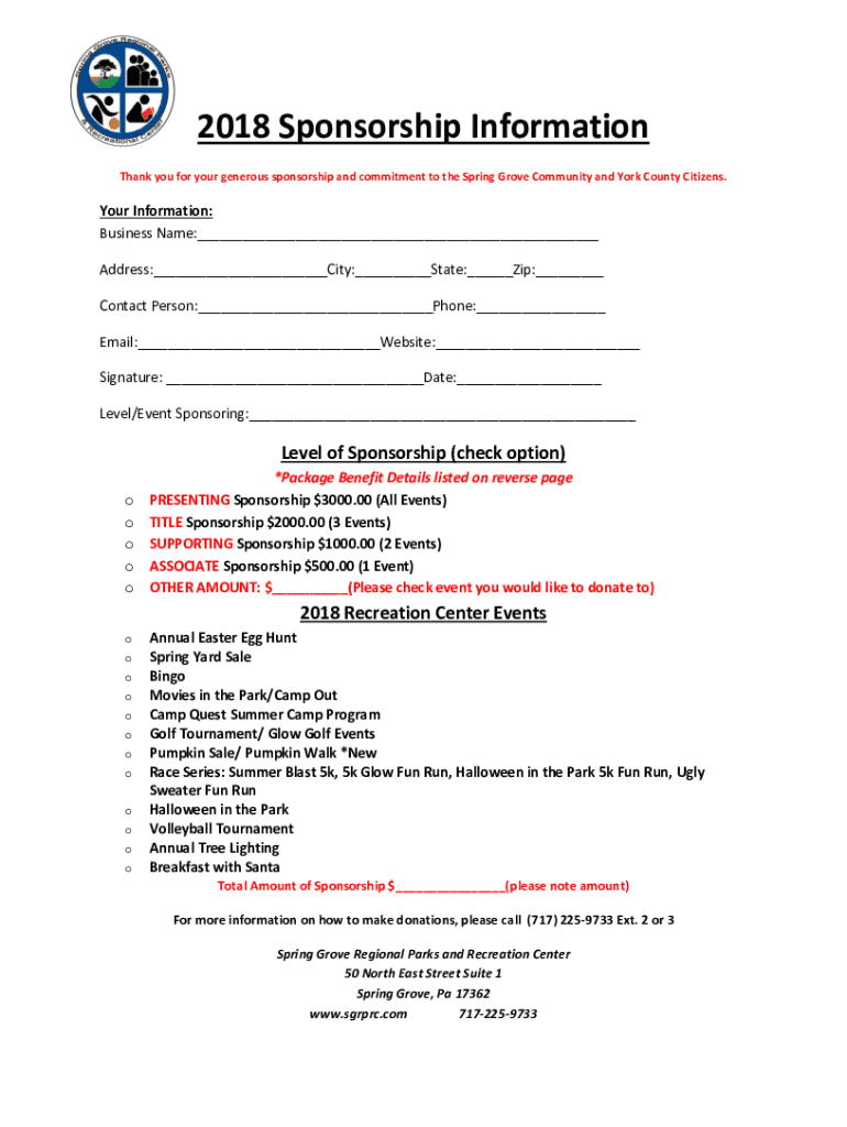 2018 Sponsorship Information Thank you for your generous sponsorship and commitment to the Spring Grove Community and York County Citizens. Your Information: Business Name: Address: City: State: Zip:
