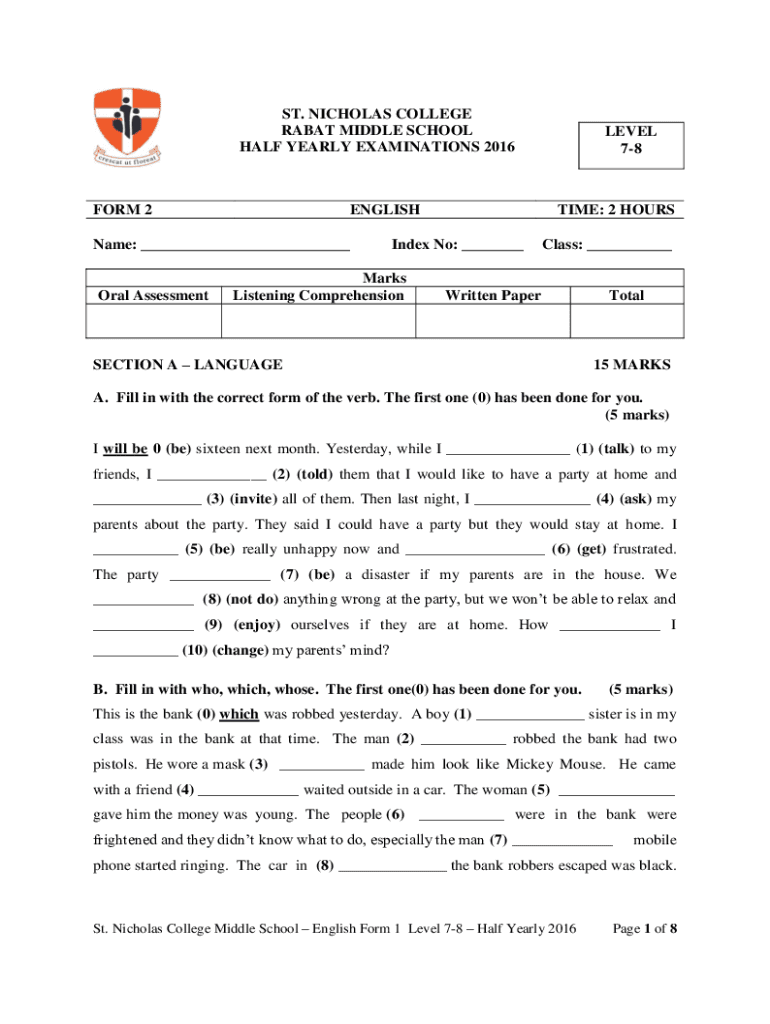 ST. NICHOLAS COLLEGE RABAT MIDDLE SCHOOL HALF YEARLY EXAMINATIONS 2016FORM 2ENGLISHName: Oral Assessment TIME: 2 HOURSIndex No: Marks Listening ComprehensionLEVEL 78Class: Written Intersection A LANGUAGETotal15