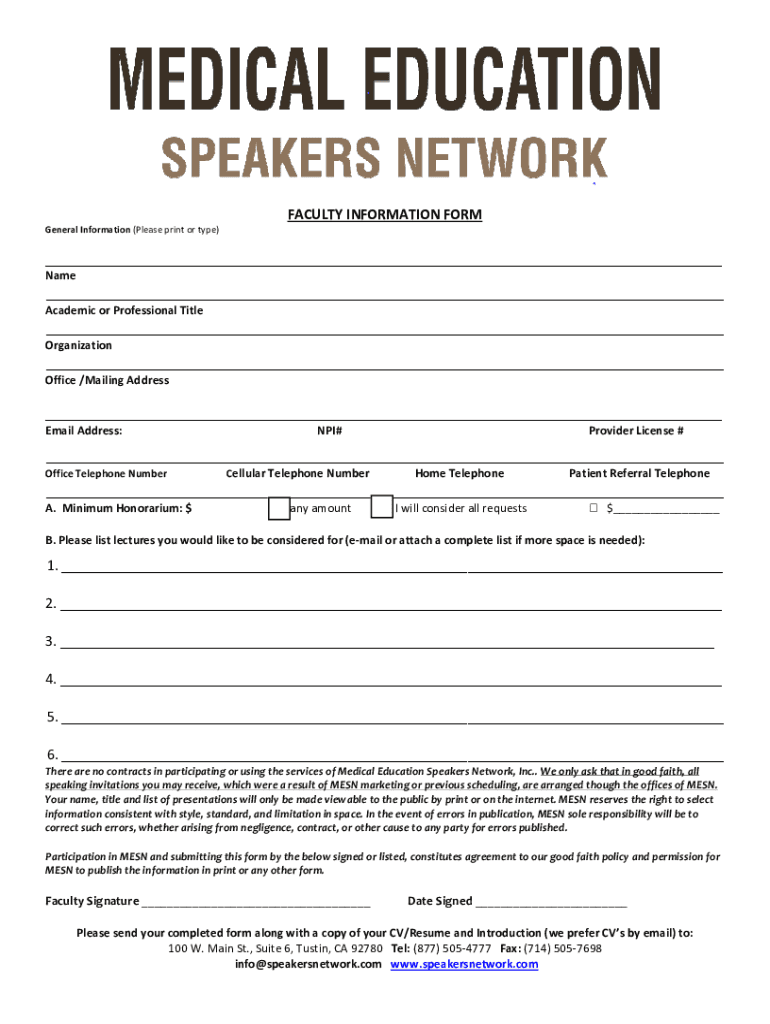 FACULTYINFORMATIONFORM GeneralInformation(Pleaseprintortype) Name AcademicorProfessionalTitle Organization Office/MailingAddress Misaddress:NPI#ProviderLicense# OfficeTelephoneNumberCellularTelephoneNumberHomeTelephonePatientReferralTelephone