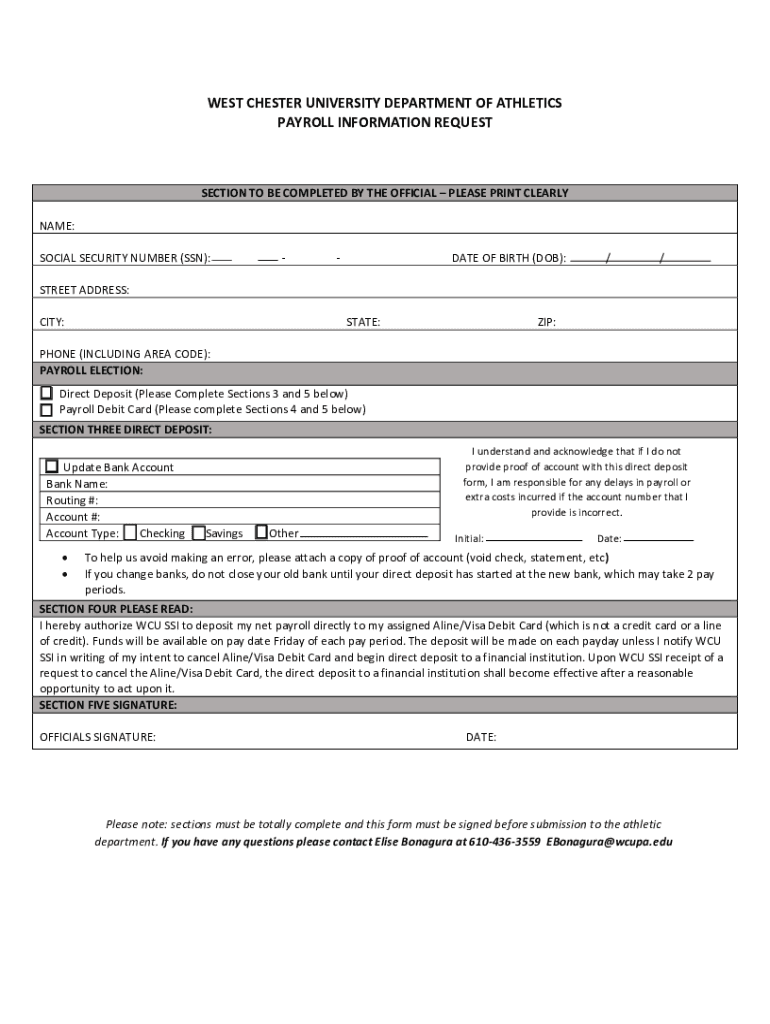 WESTCHESTERUNIVERSITYDEPARTMENTOFATHLETICS PAYROLLINFORMATIONREQUEST SECTIONTOBECOMPLETEDBYTHEOFFICIAL PLEASEPRINTCLEARLY NAME: SOCIALSECURITYNUMBER(SSN):DATEOFBIRTH(DOB):// STREETADDRESS: CITY: