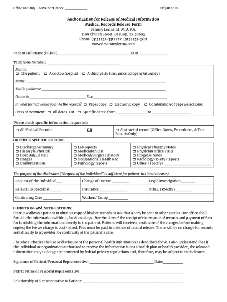 Office Use Only Account Number: Eff Jan 2018Authorization for Release of Medical Information Medical Records Release Form Sammy Lemma III, M.D. P.A. 1109 Church Street, Bastrop, TX 78602 Phone: (512)