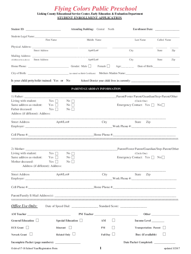 Flying Colors Public Preschool Licking County Educational Service Center, Early Education & Evaluation DepartmentSTUDENT ENROLLMENT APPLICATIONAttending Building: CentralStudent ID: NorthEnrollment