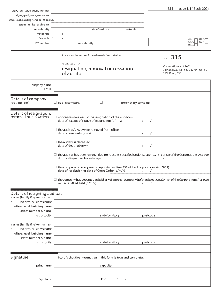 The ASIC Form 315 is a legal document used by companies in Australia to notify the Australian Securities & Investments Commission (ASIC) of an auditor's resignation, removal, or cessation.
