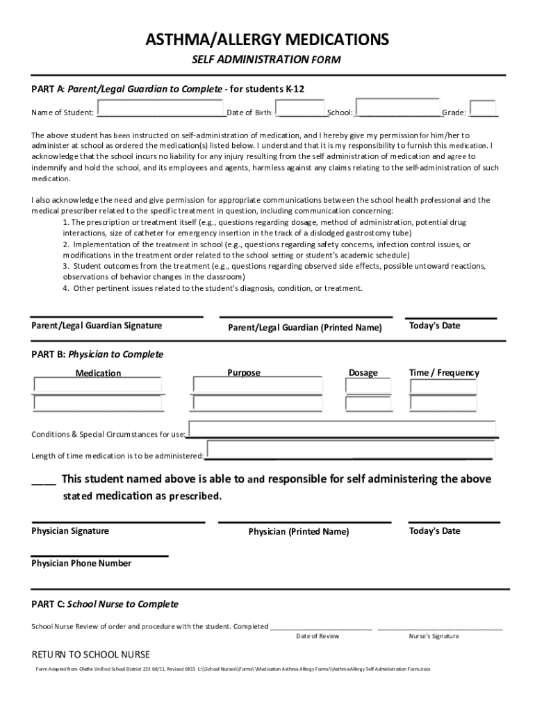 Print FormASTHMA/ALLERGY MEDICATIONS SELF ADMINISTRATION FORM PART A: Parent/Legal Guardian to Complete for students K12 Name of Student: Date of Birth: School: Grade: The above student has been instructed
