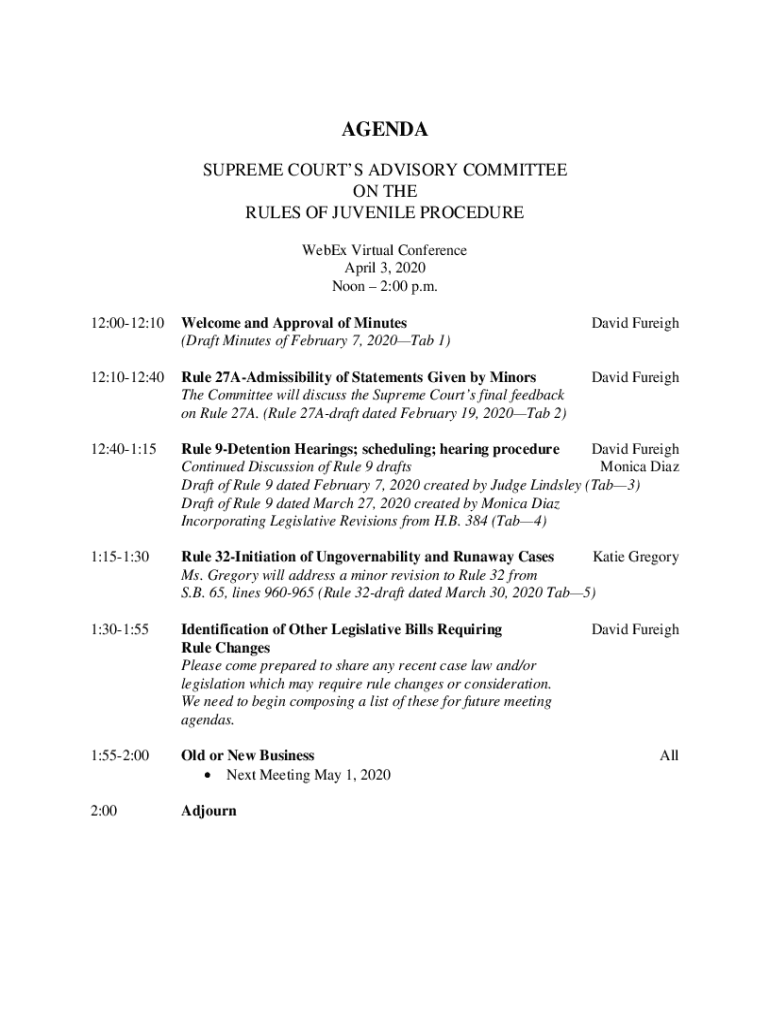 AGENDA SUPREME COURTS ADVISORY COMMITTEE ON THE RULES OF JUVENILE PROCEDURE WebEx Virtual Conference April 3, 2020, Noon 2:00 p.m. 12:0012:10Welcome and Approval of Minutes (Draft Minutes of February