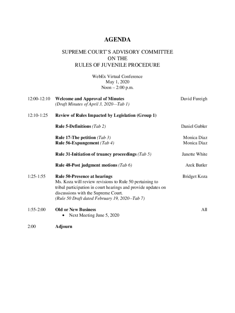 AGENDA SUPREME COURTS ADVISORY COMMITTEE ON THE RULES OF JUVENILE PROCEDURE WebEx Virtual Conference May 1, 2020, Noon 2:00 p.m. 12:0012:10Welcome and Approval of Minutes (Draft Minutes of April 3,
