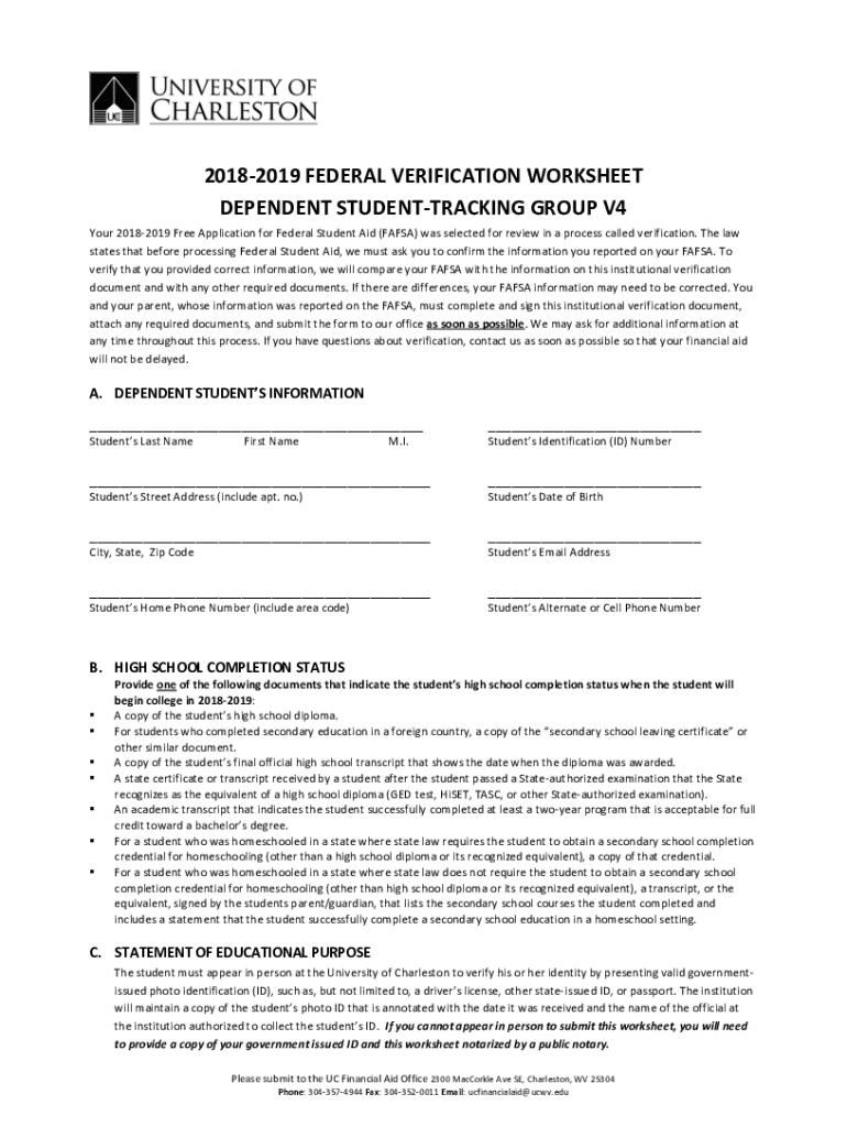 The 20182019 dependent verification worksheet is needed by students who have been selected for verification in the financial aid process.
