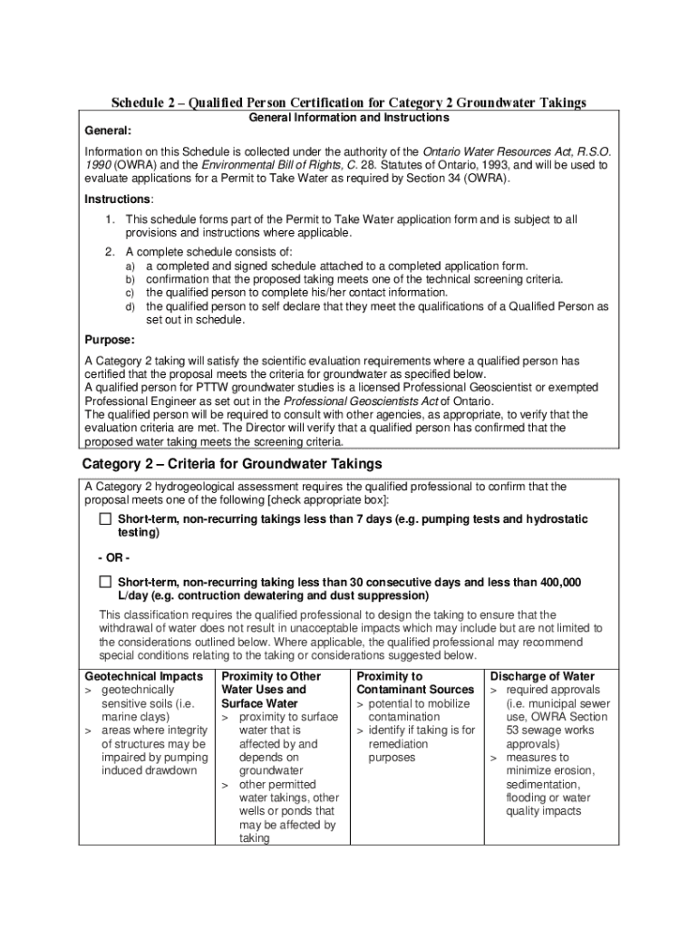 Schedule 2 Qualified Person Certification for Category 2 Groundwater Takings General Information and Instructions General: Information on this Schedule is collected under the authority of the Ontario
