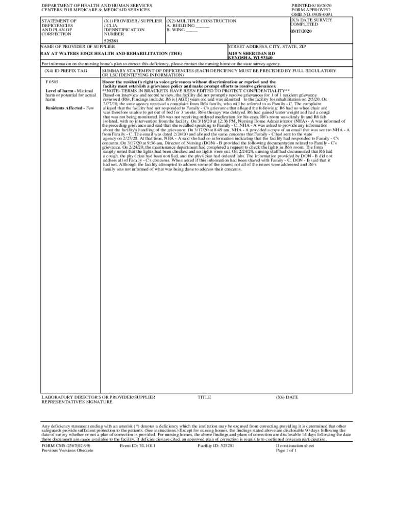 DEPARTMENT OF HEALTH AND HUMAN SERVICES CENTERS FOR MEDICARE & MEDICAID SERVICES STATEMENT OF DEFICIENCIES AND PLAN OF CORRECTIONPRINTED:8/10/2020 FORM APPROVED OMB NO. 09380391 (X3) DATE SURVEY COMPLETED(X1)