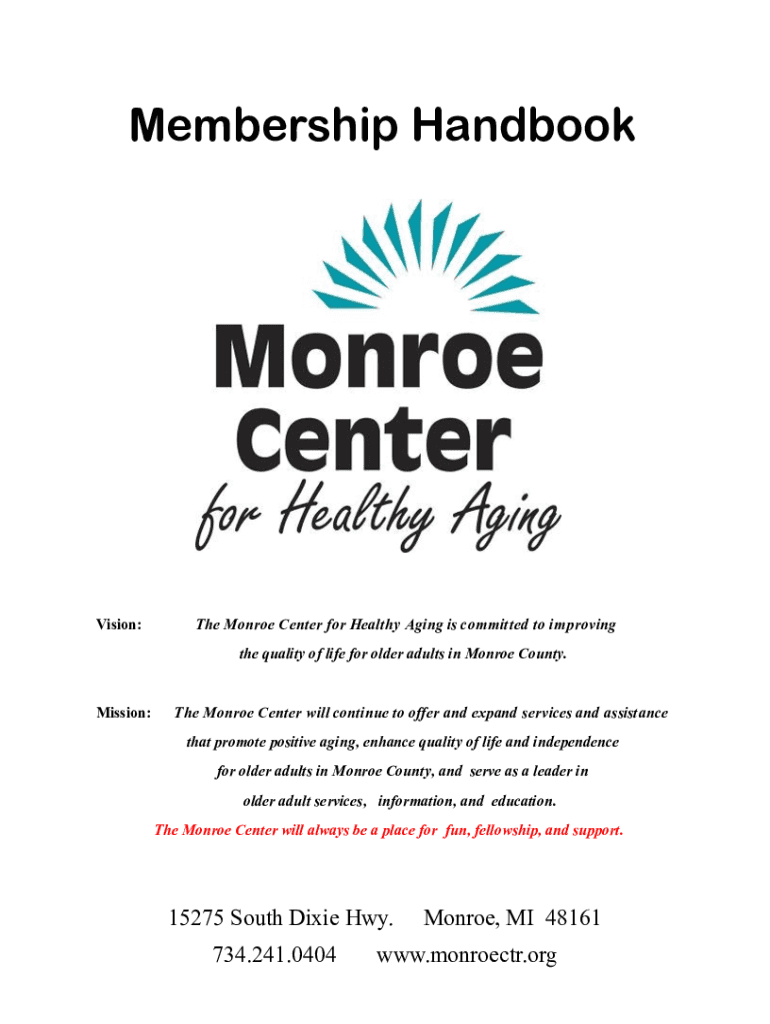 Membership HandbookVision:The Monroe Center for Healthy Aging is committed to improving the quality of life for older adults in Monroe County. Mission:The Monroe Center will continue to offer and
