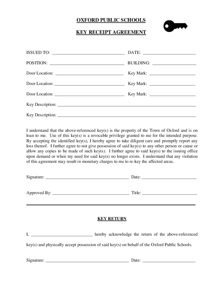 OXFORD PUBLIC SCHOOLS KEY RECEIPT AGREEMENTISSUED TO: DATE: POSITION: BUILDING: Door Location: Key Mark: Door Location: Key Mark: Door Location: Key Mark: Key Description: Key Description: I understand