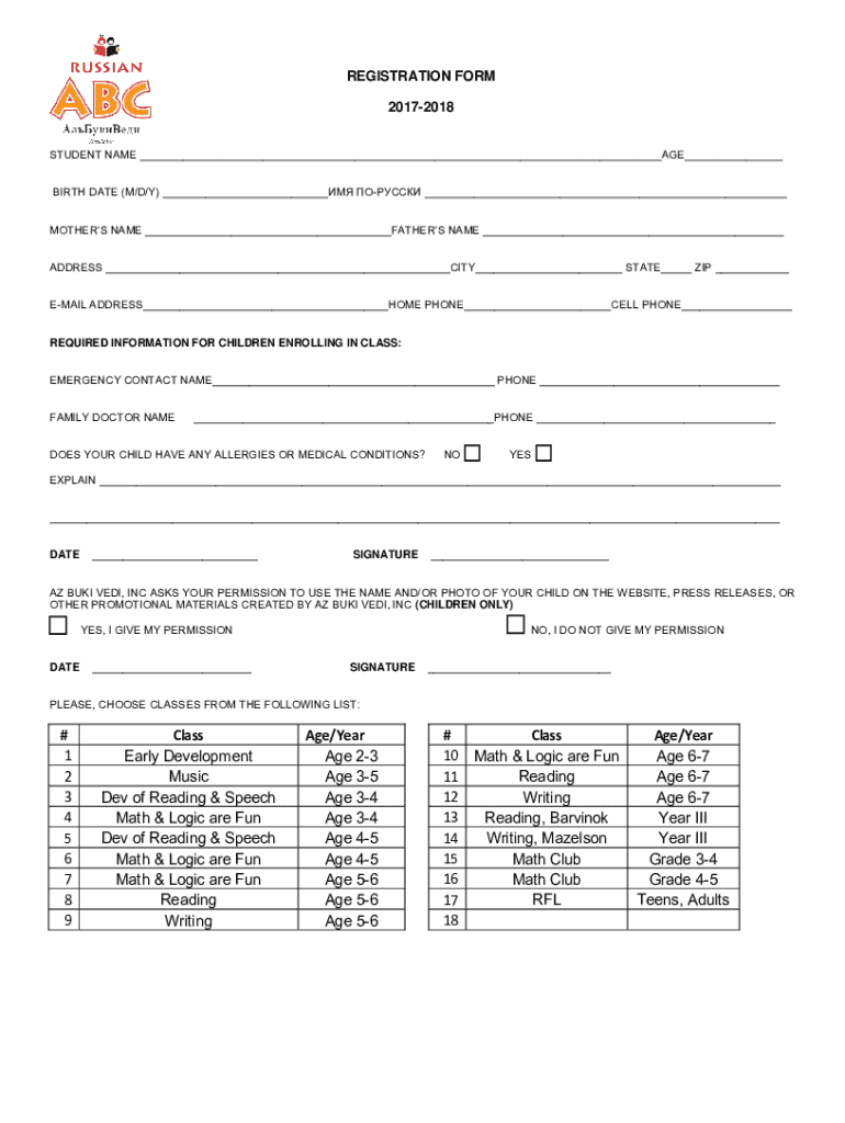REGISTRATION FORM 20172018 STUDENT NAME AGE BIRTH DATE (M/D/Y) MOTHERS NAME FATHERS NAME ADDRESS CITY STATE ZIP EMAIL ADDRESS HOME PHONE CELL PHONE REQUIRED INFORMATION FOR CHILDREN ENROLLING IN CLASS: