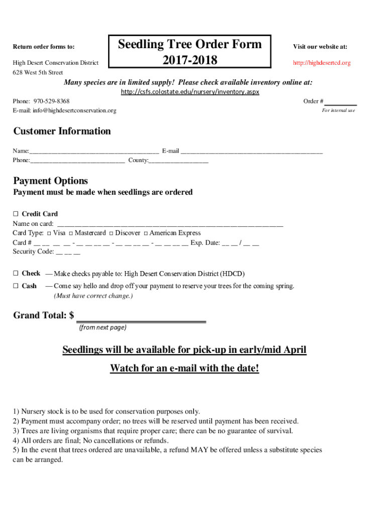 Seedling Tree Order Form 20172018Return order forms to: High Desert Conservation DistrictVisit our website at: http://highdesertcd.org628 West 5th StreetEasy species are in limited supply! Please