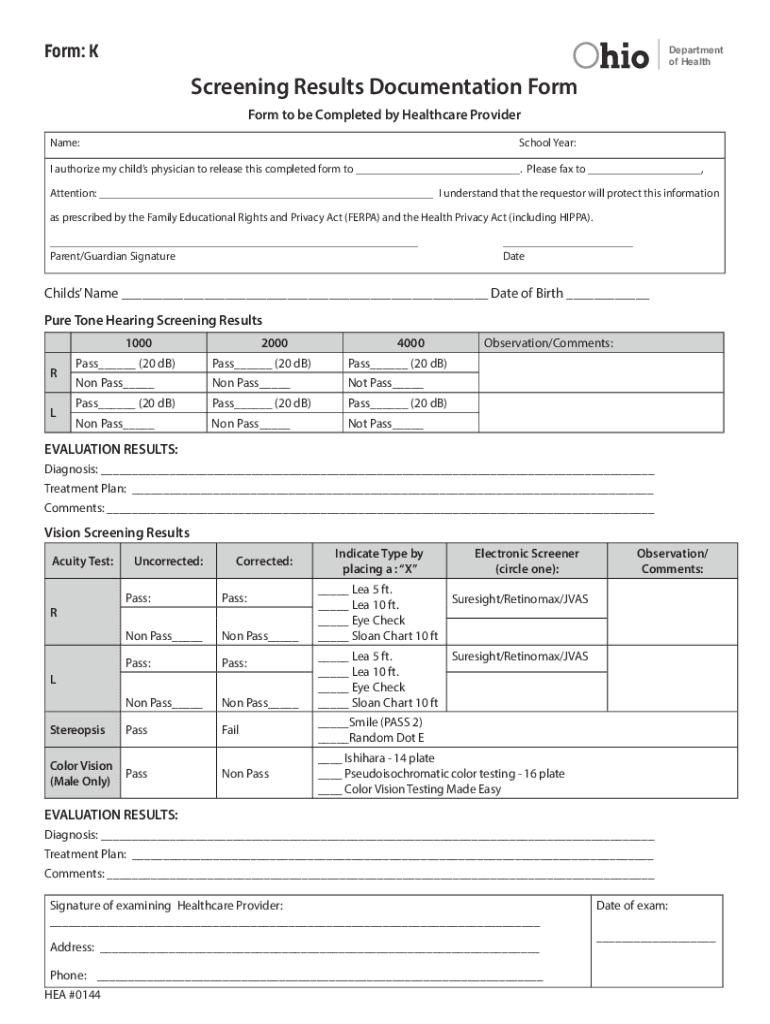 Form: Department of HealthScreening Results Documentation Form to be Completed by Healthcare Provider Name:School Year:I authorize my children physician to release this completed form to. Please fax