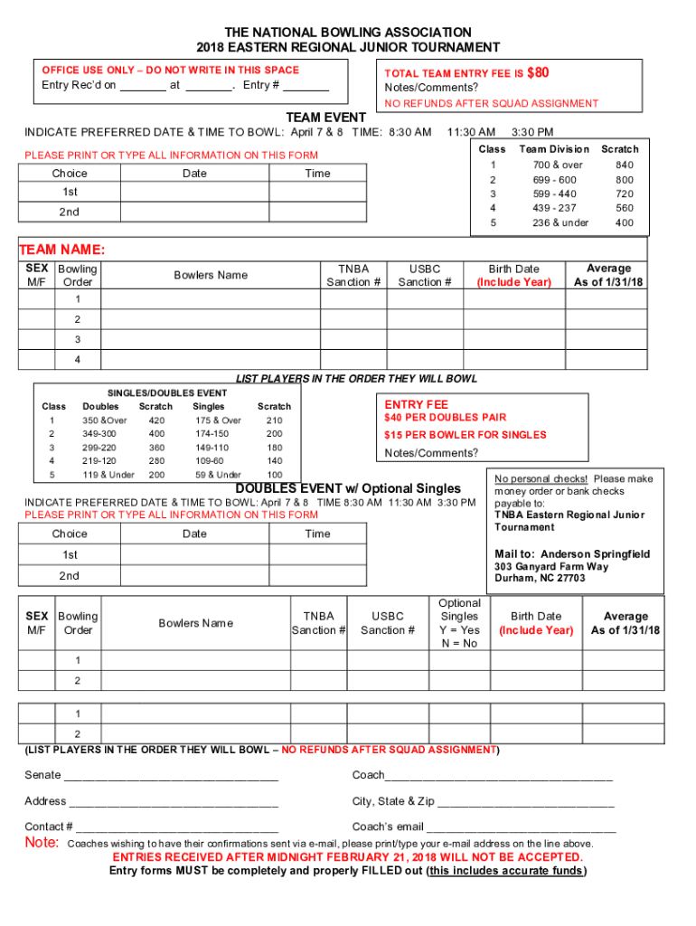 THE NATIONAL BOWLING ASSOCIATION 2018 EASTERN REGIONAL JUNIOR TOURNAMENT TOTAL TEAM ENTRY FEE IS $80OFFICE USE ONLY DO NOT WRITE IN THIS Pageantry Recd on at. Entry # Notes/Comments?TEAM EVEN TNO