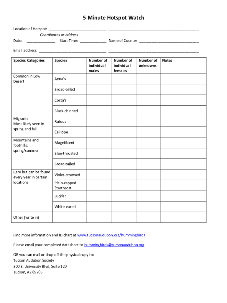 5Minute Hotspot Watch Location of Hotspot: Coordinates or address Date: Start Time: Name of Counter Email address: Species CategoriesSpeciesCommon in Low DesertAnnasNumber of individual malesNumber