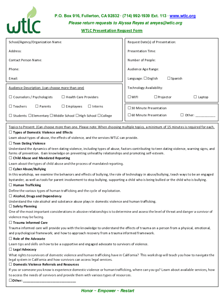 This form is particularly useful for individuals, organizations, or event organizers who want to invite WTLC to present on topics related to domestic violence, advocacy, support services, or related subjects.