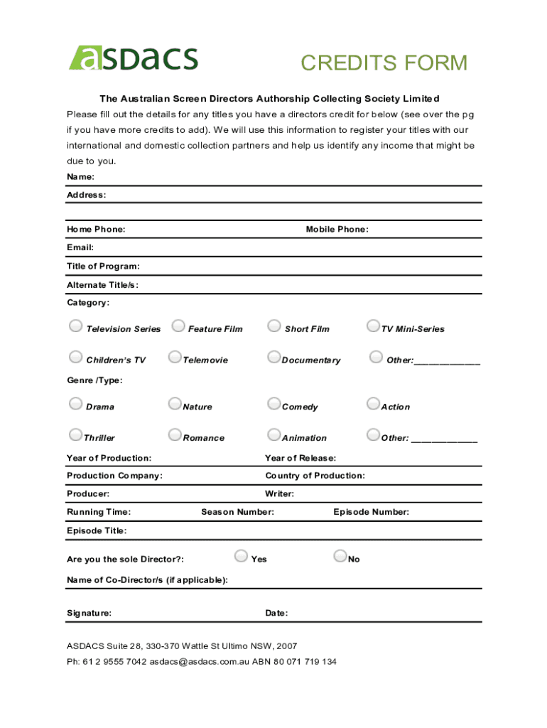 The asdacs credits form is required by individuals who are seeking to apply for or renew their asdacs credits. This form is typically used by individuals who work in the creative industry and wish to claim tax credits for their eligible expenses related to their creative projects.