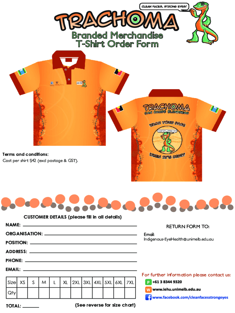 Branded Merchandise Shirt Order Formers and conditions:Cost per shirt $42 (excl postage & GST).CUSTOMER DETAILS (please fill in all details) NAME:RETURN FORM TO:Organization:Email: IndigenousEyeHealth