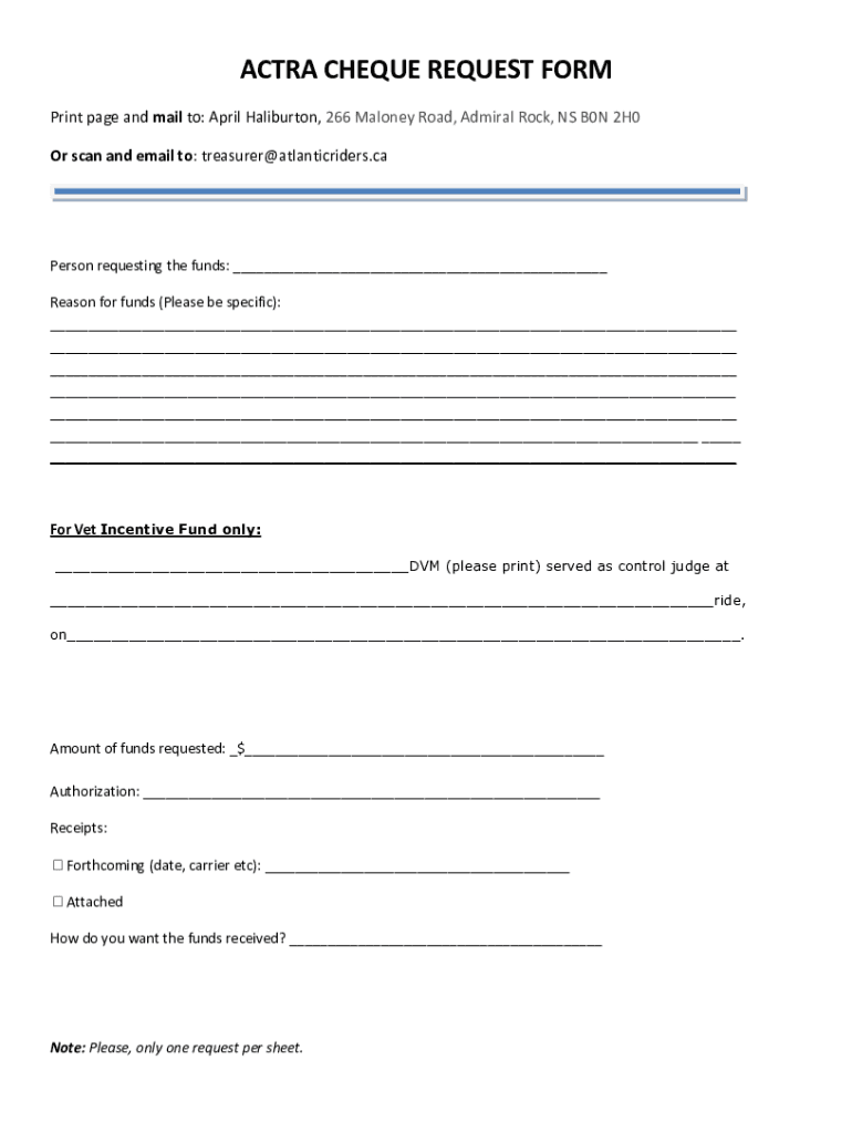 ACCRA Check REQUEST FORM Print page and mail to: April Haliburton, 266 Maloney Road, Admiral Rock, NS B0N 2H0 Or scan and email to: treasurer atlanticriders. Person requesting the funds: Reason for