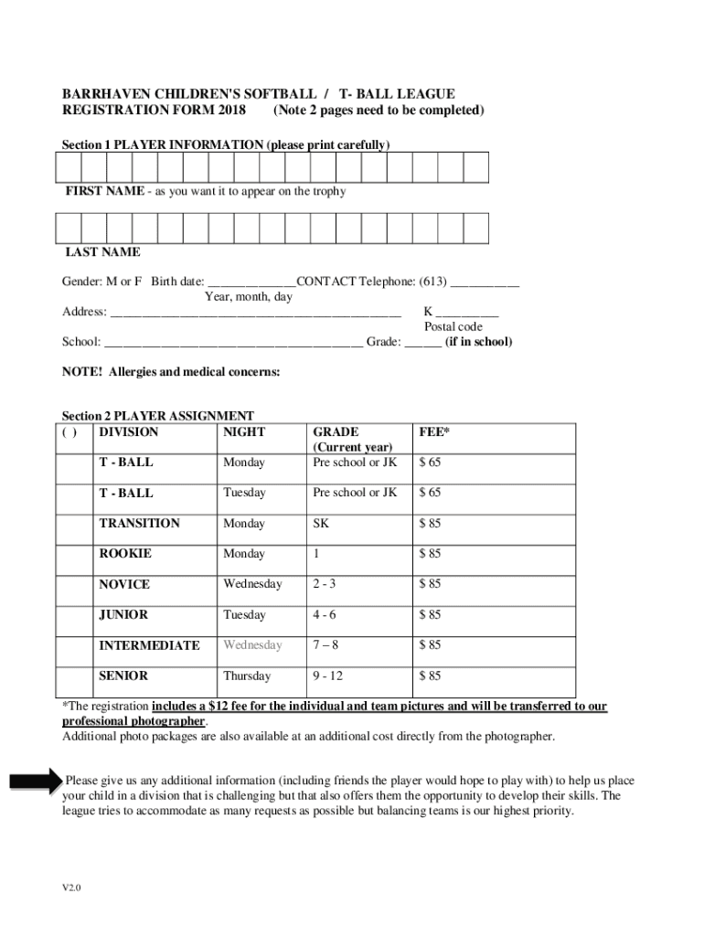BARRAGE CHILDREN IS SOFTBALL / T BALL LEAGUE REGISTRATION FORM 2018 (Note 2 pages need to be completed) Section 1 PLAYER INFORMATION (please print carefully)FIRST NAME as you want it to appear on