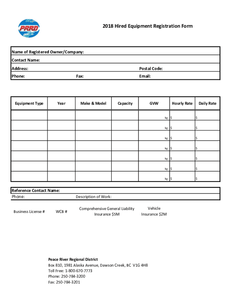 Get the free 2018 Hired Equipment Registration Form - prrd bc
