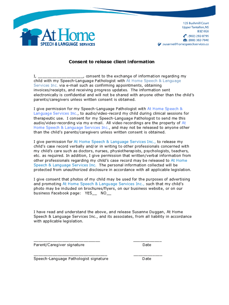 Consent to release client information I, consent to the exchange of information regarding my child with my SpeechLanguage Pathologist with At Home Speech & Language Services Inc. via email such as
