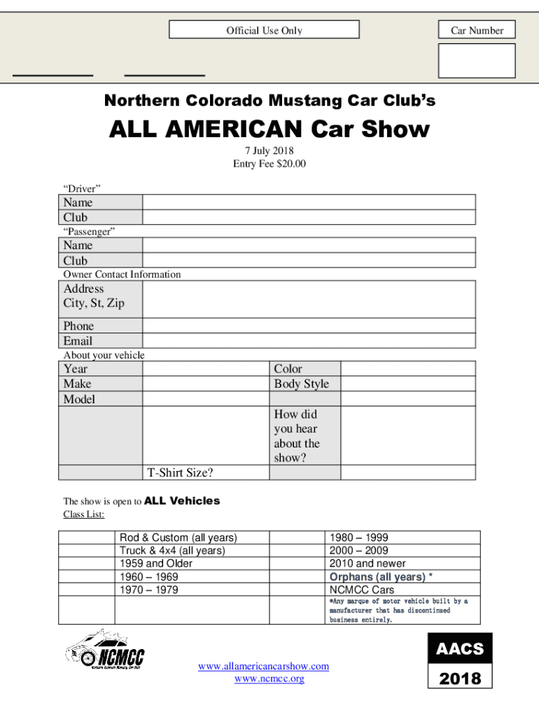 Official Use IndyCar NumberNorthern Colorado Mustang Car Clubs ALL AMERICAN Car Show 7 July 2018 Entry Fee $20.00 Riverdale Club PassengerName Club Owner Contact InformationAddress City, St, Zip Phone