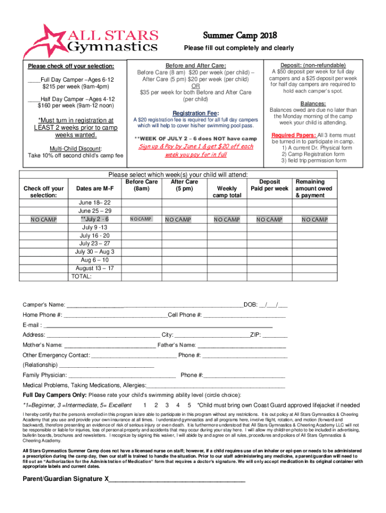 Summer Camp 2018 Please fill out completely and clearly Deposit: (nonrefundable) A $50 deposit per week for full day campers and a $25 deposit per week for half day campers are required to hold each