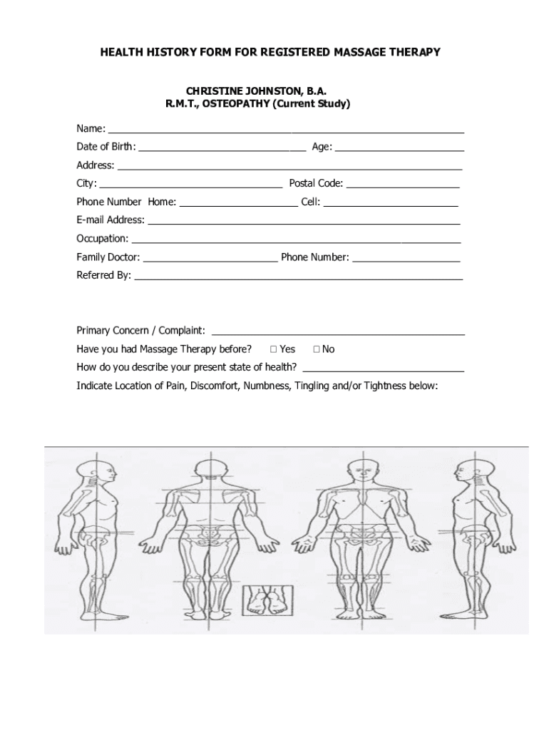 HEALTH HISTORY FORM FOR REGISTERED MASSAGE THERAPY CHRISTINE JOHNSTON, B.A. R.M.T., OSTEOPATHY (Current Study) Name: Date of Birth: Age: Address: City: Postal Code: Phone Number Home: Cell: Email