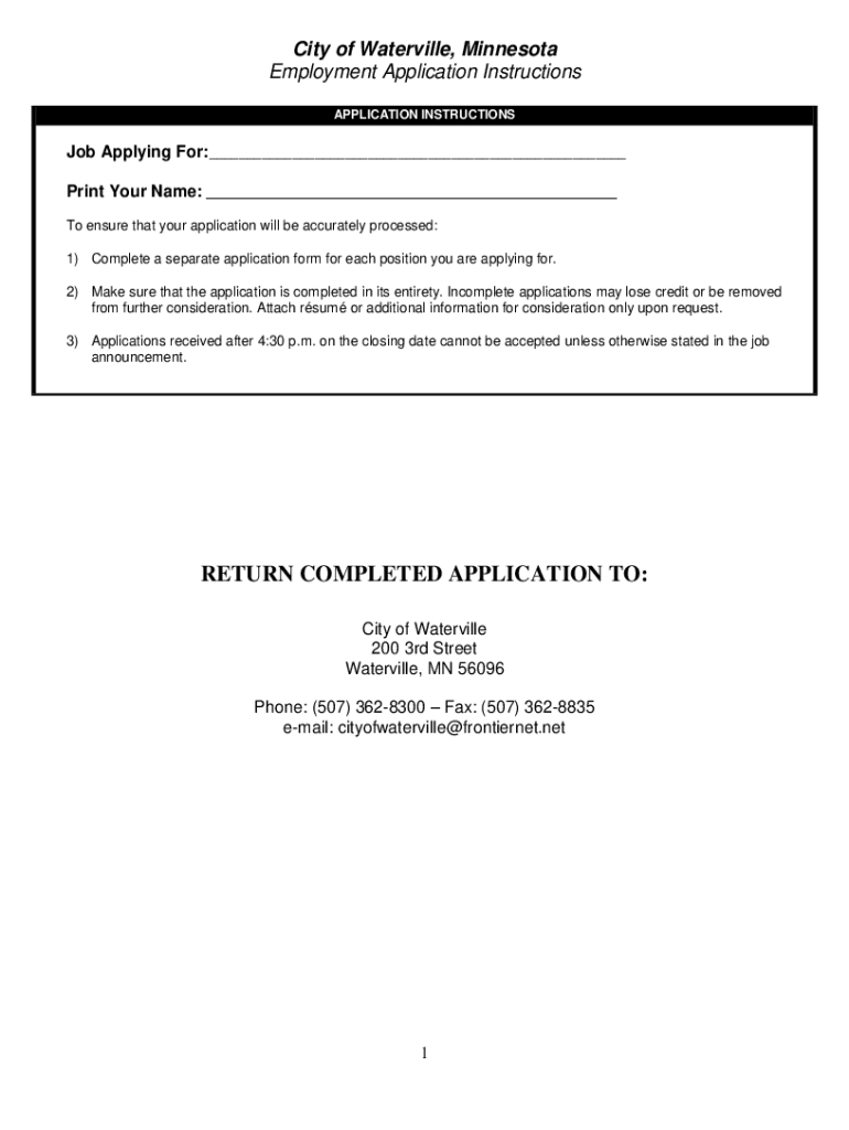 City of Waterville, Minnesota Employment Application Instructions Job Applying For: Print Your Name: To ensure that your application will be accurately processed: 1) Complete a separate application