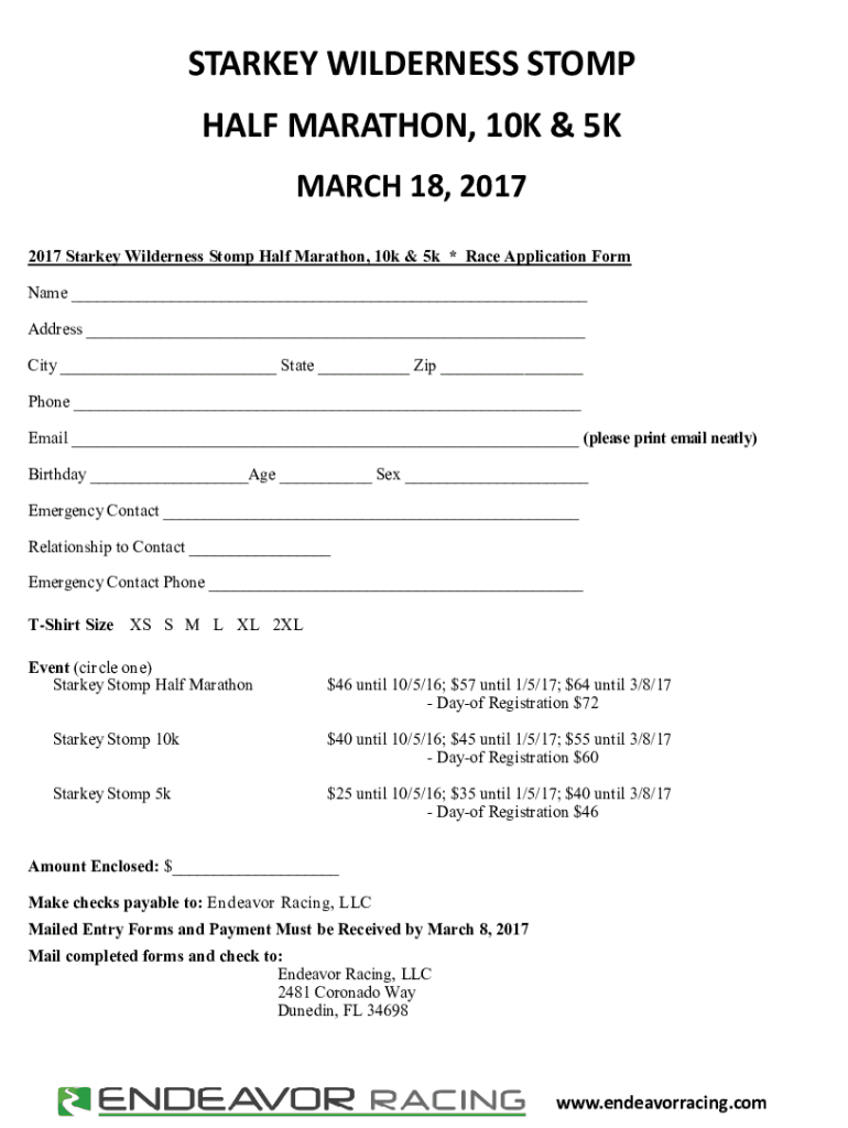 STARKEY WILDERNESS STOMP HALF MARATHON, 10K & 5K MARCH 18, 2017 2017 Starkey Wilderness Stomp Half Marathon, 10k & 5k * Race Application Form Name Address City State Zip Phone Email (please print