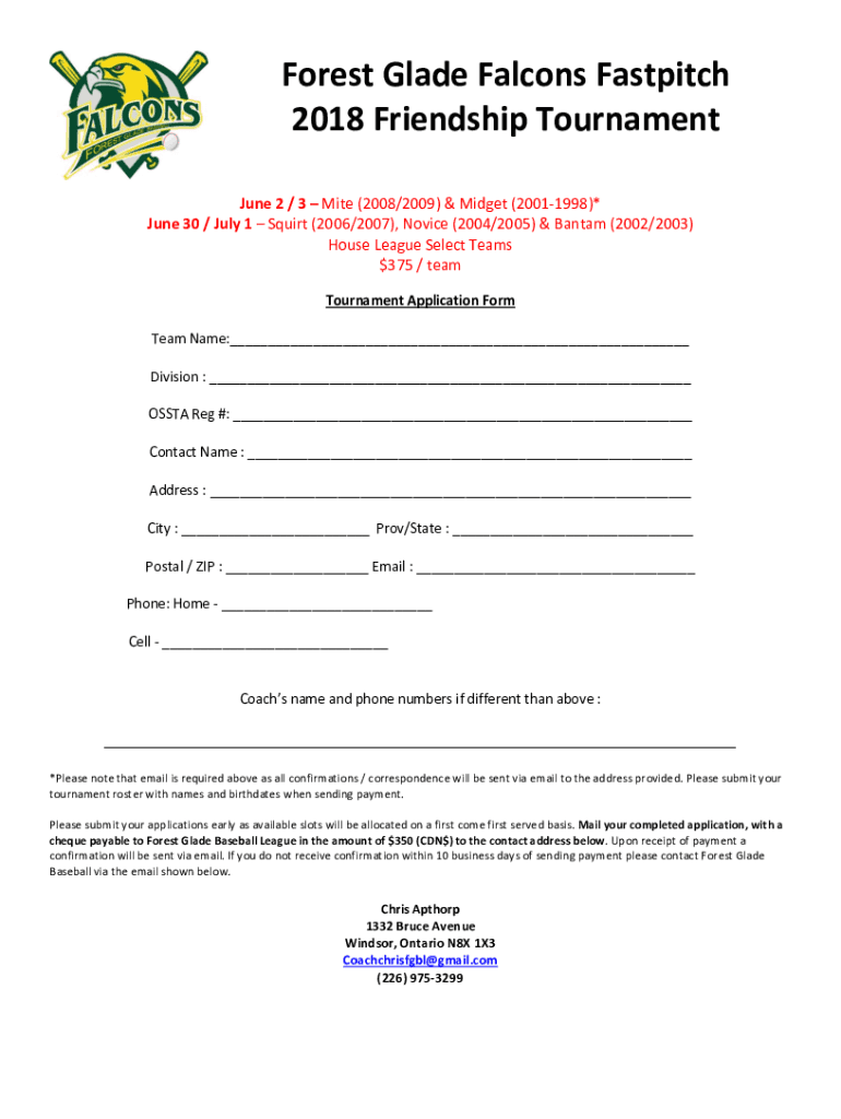 Forest Glade Falcons Fast pitch 2018 Friendship Tournament June 2 / 3 Mite (2008/2009) & Midget (20011998)* June 30 / July 1 Squirt (2006/2007), Novice (2004/2005) & Bantam (2002/2003) House League