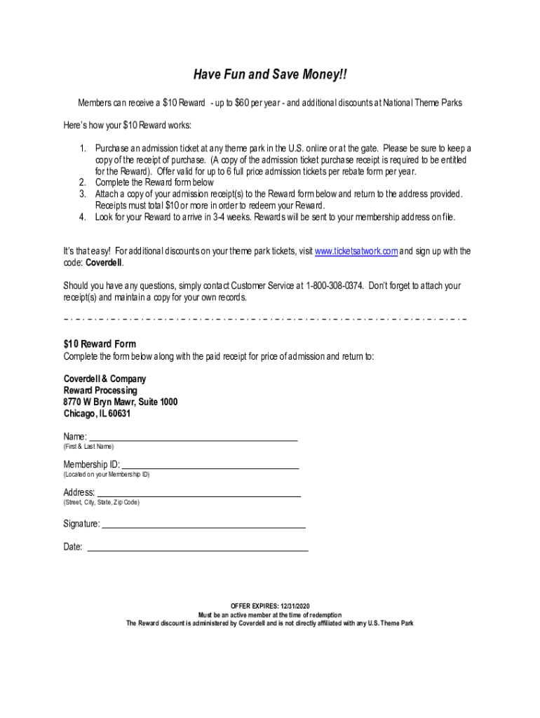 Have Fun and Save Money!! Members can receive a $10 Reward up to $60 per year and additional discounts at National Theme Parks Here show your $10 Reward works: 1. Purchase an admission ticket at any
