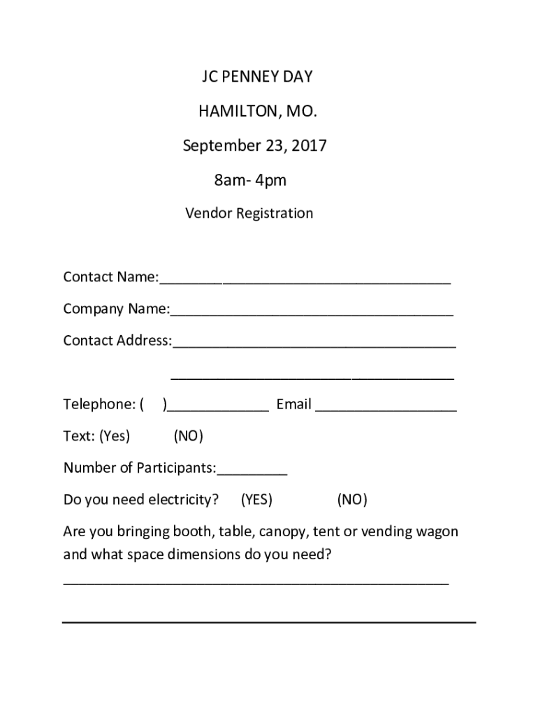 JC PENNEY DAY HAMILTON, MO. September 23, 2017 8am 4pm Vendor RegistrationContact Name: Company Name: Contact Address: Telephone: (Text: (Yes)) Email (NO)Number of Participants: Do you need electricity?(YES)(NO)Are