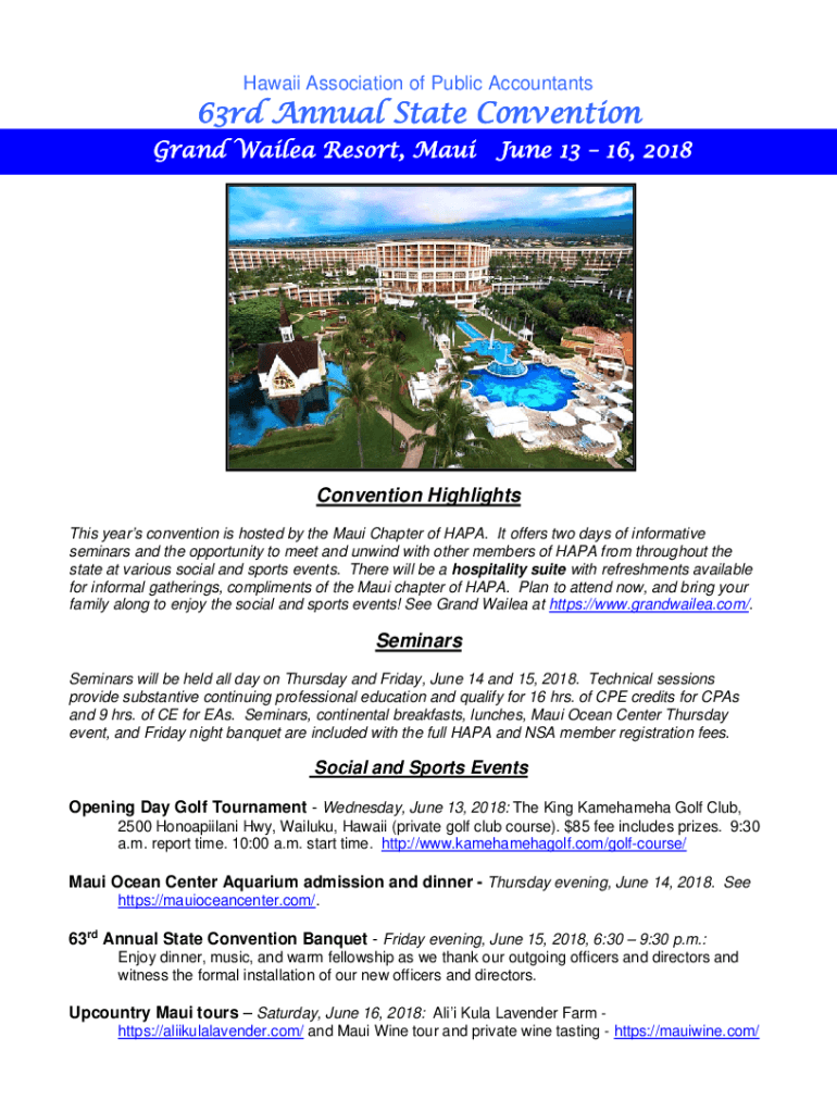 Hawaii Association of Public Accountants63rd Annual State Convention Grand Wailed Resort, Maui June 13 16, 2018Convention Highlights This year's convention is hosted by the Maui Chapter of APA. It