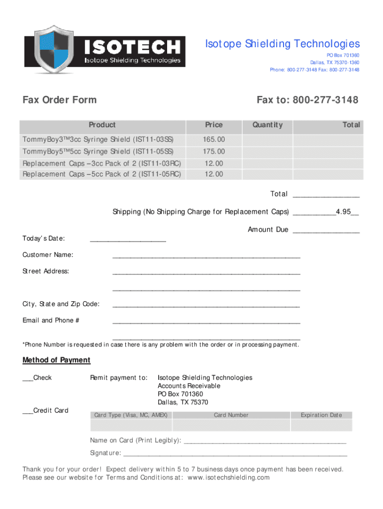 Isotope Shielding Technologies PO Box 701360 Dallas, TX 753701360 Phone: 8002773148 Fax: 8002773148Fax Order Format to: 8002773148ProductPriceTommyBoy3 3cc Syringe Shield (IST1103SS)165.00TommyBoy5