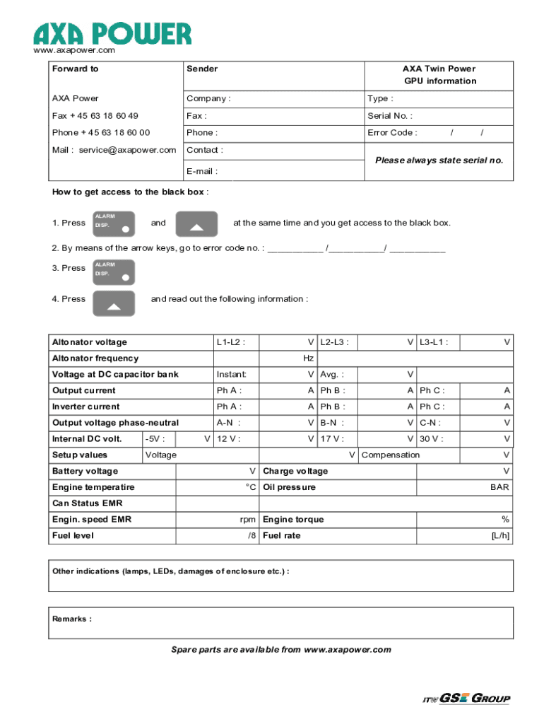 WWW.axapower.com Forward toSenderAXA Twin Power GPU informational Intercompany :Type :Fax + 45 63 18 60 49Fax :Serial No. Phone + 45 63 18 60 00Phone :Error Code :Mail : service airpower. Noncontact