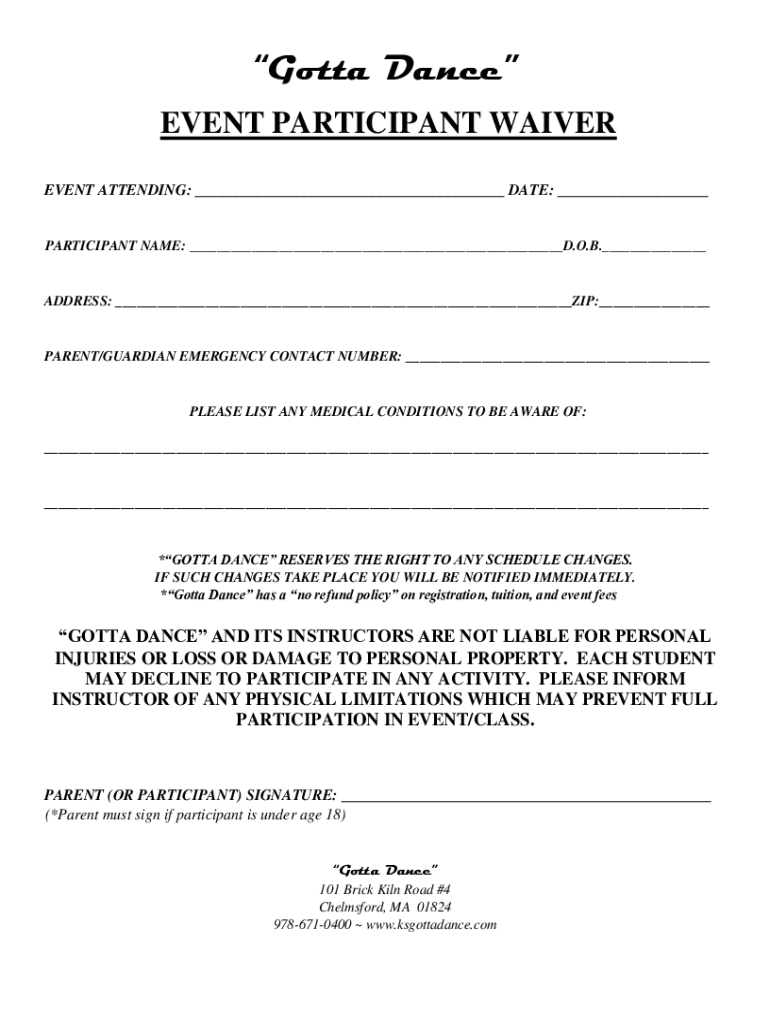 I've to Dance EVENT PARTICIPANT WAIVER EVENT ATTENDING: DATE: PARTICIPANT NAME: D.O.B. ADDRESS: ZIP: PARENT/GUARDIAN EMERGENCY CONTACT NUMBER: PLEASE LIST ANY MEDICAL CONDITIONS TO BE AWARE OF: *GOTTA