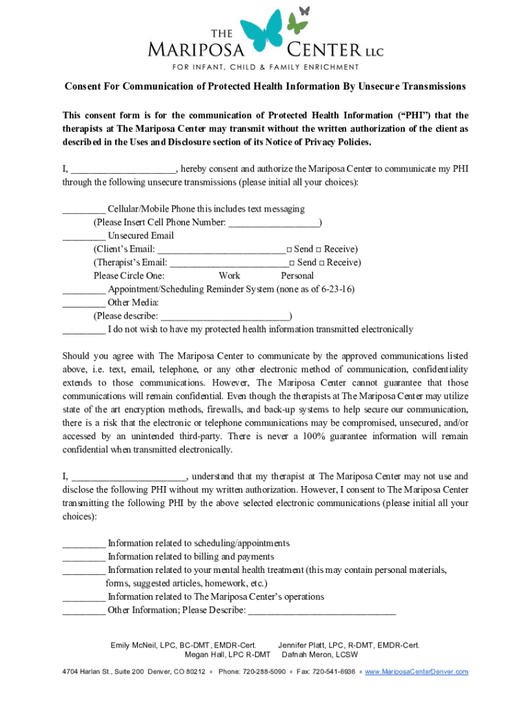 Consent For Communication of Protected Health Information By Unsecure Transmissions This consent form is for the communication of Protected Health Information (PHI) that the therapists at The Mariposa