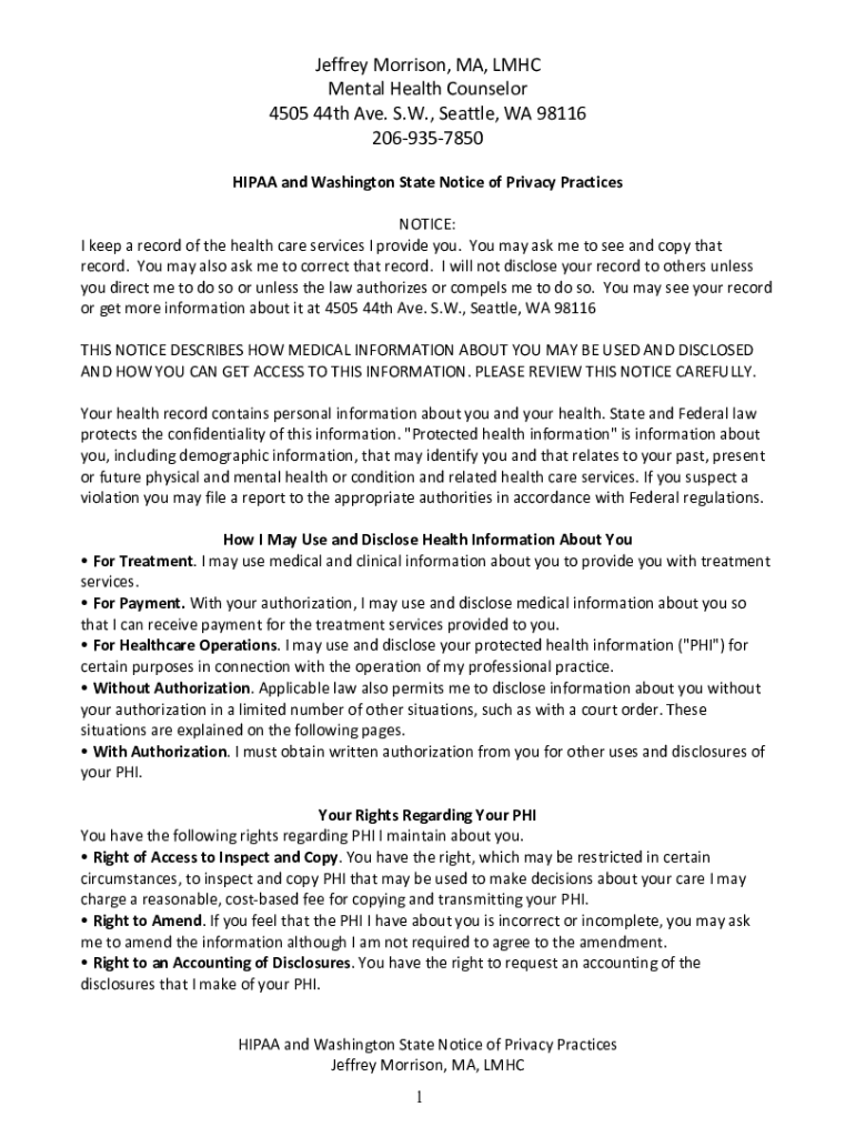 Jeffrey Morrison, MA, LMHCMental Health Counselor4505 44th Ave. S.W., Seattle, WA 981162069357850HIPAA and Washington State Notice of Privacy PracticesNOTICE:I keep a record of the health care services I provide you.
