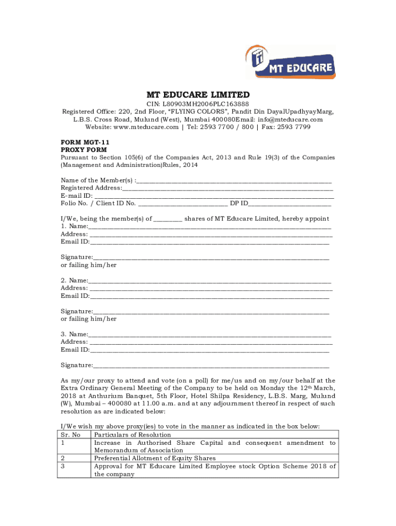 MT EDUCATE LIMITED IN: L80903MH2006PLC163888 Registered Office: 220, 2nd Floor, FLYING COLORS, Pandit Din DayalUpadhyayMarg, L.B.S. Cross Road, Mound (West), Mumbai 400080Email: info mteducare.com