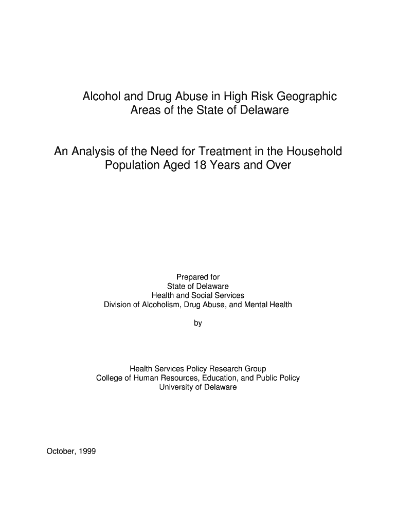 Alcohol and Drug Abuse in High Risk Geographic Areas of the State of Delaware An Analysis of the Need for Treatment in the Household Population Aged 18 Years and Over Prepared for State of Delaware