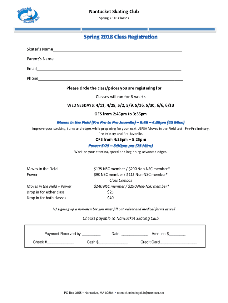 Nantucket Skating Club Spring 2018 ClassesSkaters Name Parents Name Email Phone Please circle the class/prices you are registering for Classes will run for 8 weeks WEDNESDAYS: 4/11, 4/25, 5/2, 5/9,