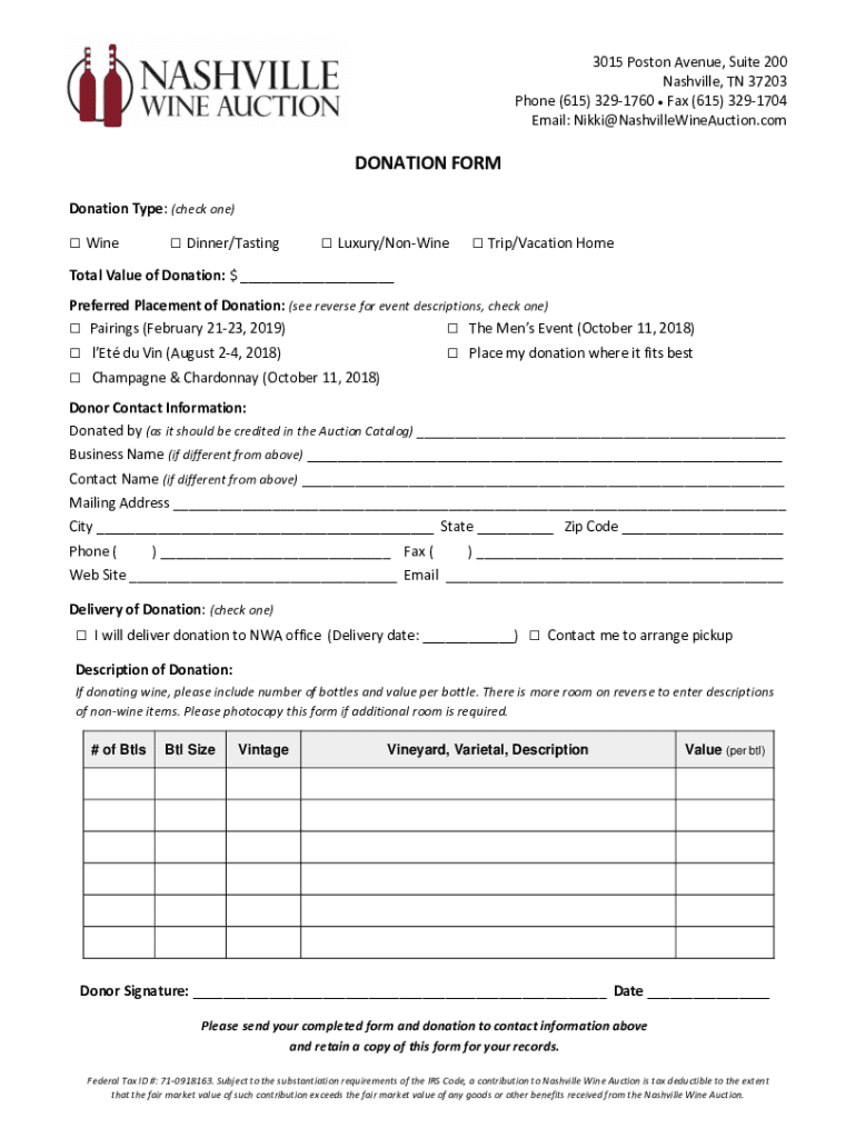 3015 Boston Avenue, Suite 200 Nashville, TN 37203 Phone (615) 3291760 Fax (615) 3291704 Email: Nikki NashvilleWineAuction. Combination FORM Donation Type: (check one) Wine Dinner/Tasting Luxury/Online