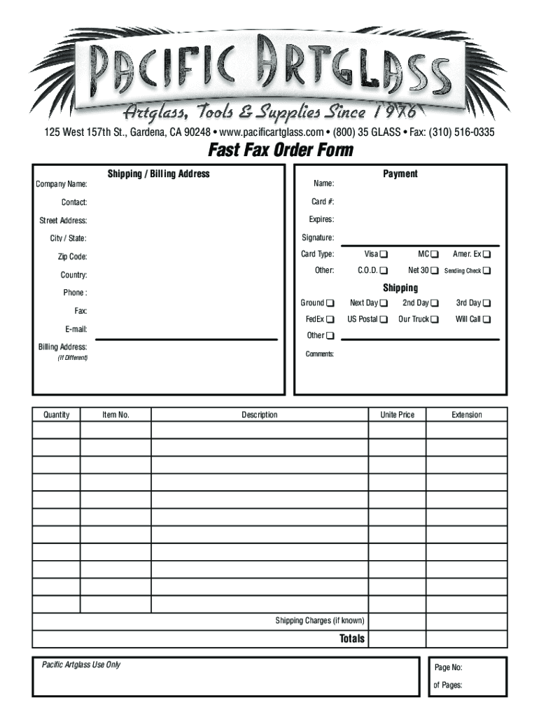 125 West 157th St., Garden, CA 90248 www.pacificartglass.com (800) 35 GLASS Fax: (310) 5160335Fast Fax Order Form Company Name:Shipping / Billing AddressPaymentName:Contact:Card #:Street Address:Expires:City