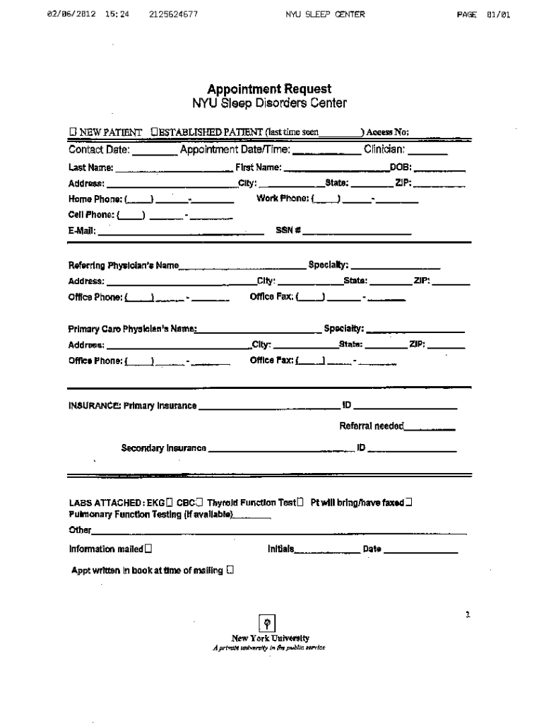 02/06/201215:242125624677NYU SLEEP CENTERPAGEAppointment Request NYU Sleep Disorders Center D NEW PATIENTGESTABLISHED PATIENT Hast time recontact Date: Last Name:) Access No:Appointment Date/Time:,