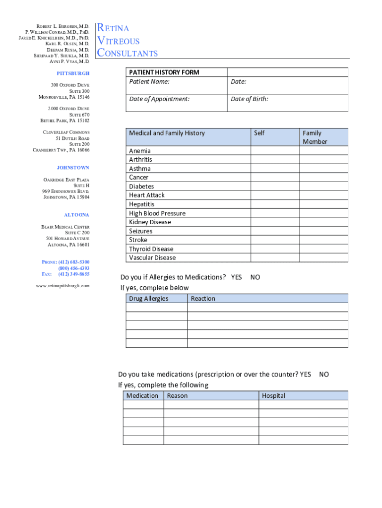 RETINA VITREOUS CONSULTANTSROBERT L. BERGEN, M.D. P. WILLIAM CONRAD, M.D., PhD. JARED E. KNICKELBEIN, M.D., PhD. KARL R. OLSEN, M.D. DEEP AM RUSSIA, M.D. SHIPPED Y. SHULA, M.D. AGNI P. WAS, M.D.PATIENTHISTORYFORM